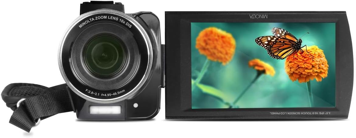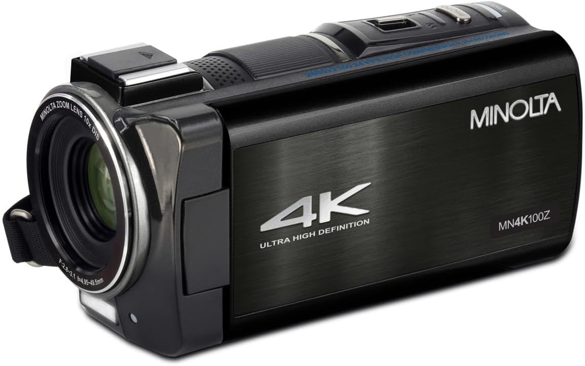 Minolta 4K Ultra HD Camcorder with 3.5-inch Touchscreen – 10x Optical Zoom, 28MP Photos, Digital Stabilizer, Accessory Shoe Mount, Time Lapse, Face Detection, 32GB Card, Remote Control (Black)